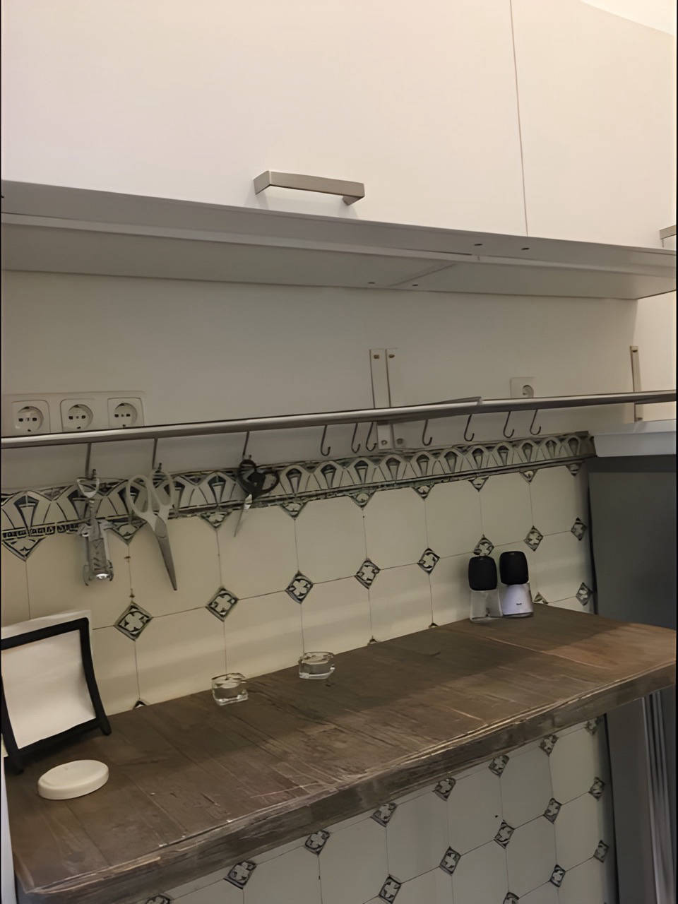 Die schicke Küche ist mit Herd und Spüle, Waschmaschine, Trockner, Geschirrspüle, Mikrowelle und Kühlgefrierkombination namhafter Hersteller sowie mit Geschirr und Küchenutensilien voll ausgestattet. Eine Design-Arbeitsplatte aus Holz mit einem kleinen Sitzbereich rundet die Einrichtung ab und ein wunderschönes historisches Kachelbild sorgt für Gemütlichkeit.