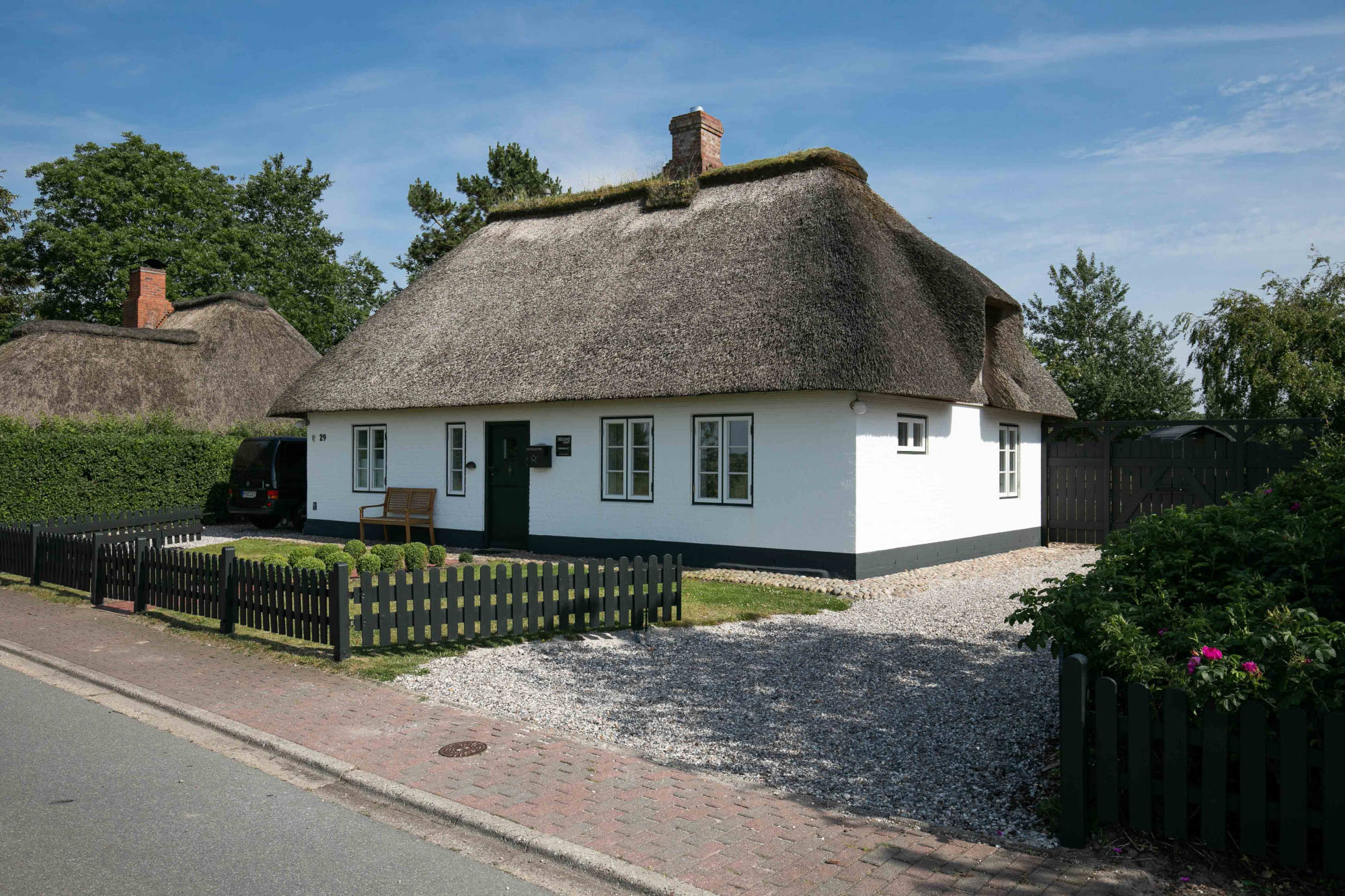 Außen - reetgedeckt, weißes Mauerwerk, dunkelgrüne Eingangstür, weiße Fenster mit dunkelgrünen Blendrahmen. Innen – alle Wände verputzt, Fußböden im Erdgeschoss Eichendielen und Fliesen – Holzdecken mit sichtbarer Balkenlage – kurzum ein echter Traum für 2 (geht auch für 4).