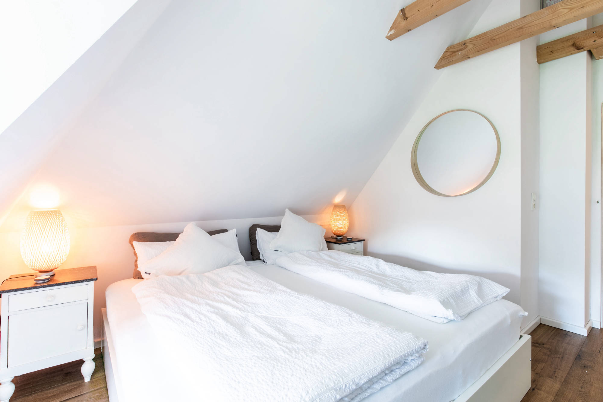 2 (Doppel-)Betten mit hochwertigen Lattenrosten – also Platz für 4, mit XL Bettdecken 155x220cm.