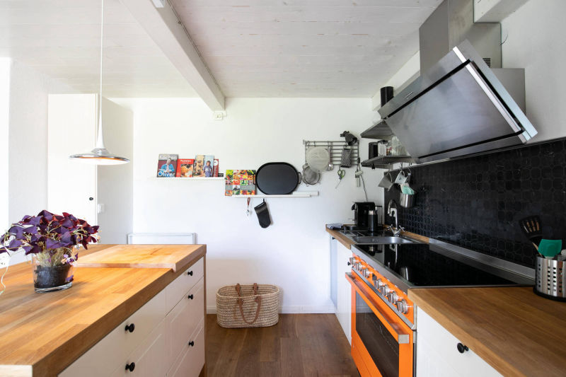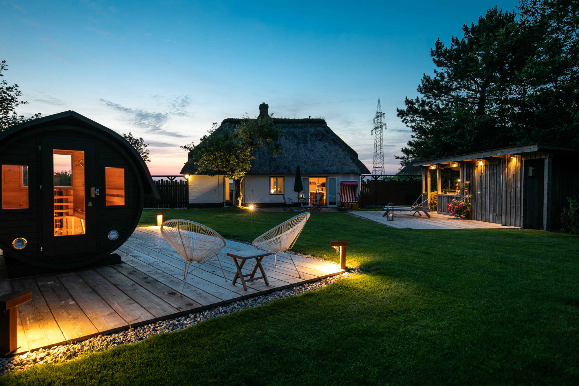 Im nach hinten gelegenen und eingefassten Garten können unsere Gäste Outdoor-Living überdacht oder auf Terrassen genießen, eine Fass-Sauna sorgt für zusätzliche Entschleunigung. Drinnen im offenen Essbereich kann danach auf dem SMEG Portofino Standherd die ganz private Koch-Show gestartet werden.