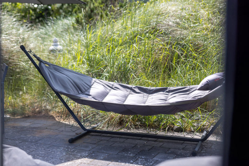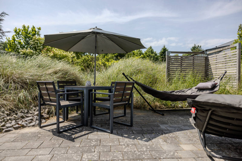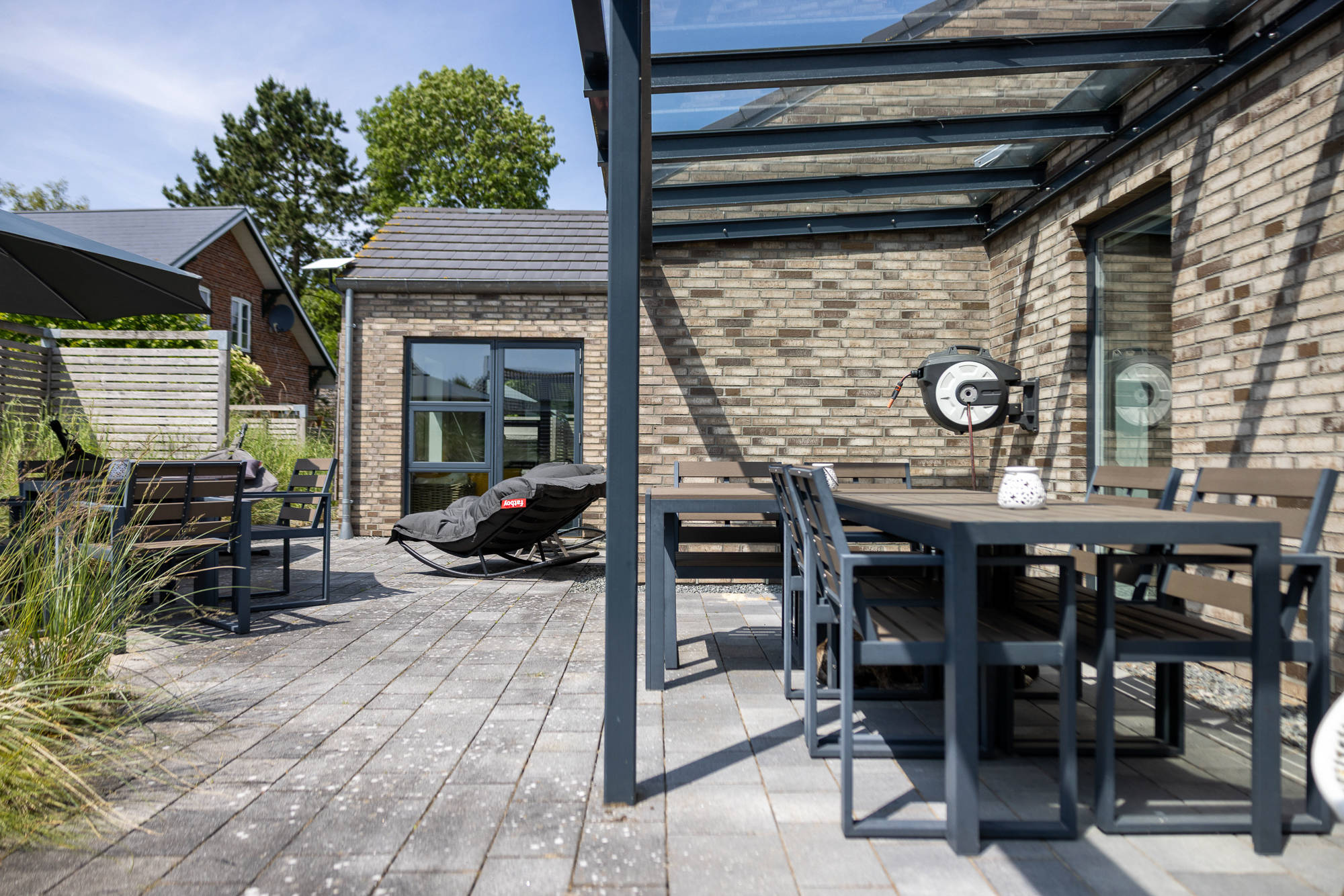 Apropos Draußen – die Terrassen sind beide perfekt ausgestattet. Eine für Sonnen-Anbeter mit Strandkorb und Beach-Club-Sitzecke. Die andere mit Lounge-Möbeln, einer Grill-Ecke und einem Glasdach, unter dem man auch genial sitzen kann, wenn der Wetter-Gott mal weniger gut gelaunt ist – ODER wir eine von diesen tropischen Nächten im Sommer haben (sollen ja mehr werden…).