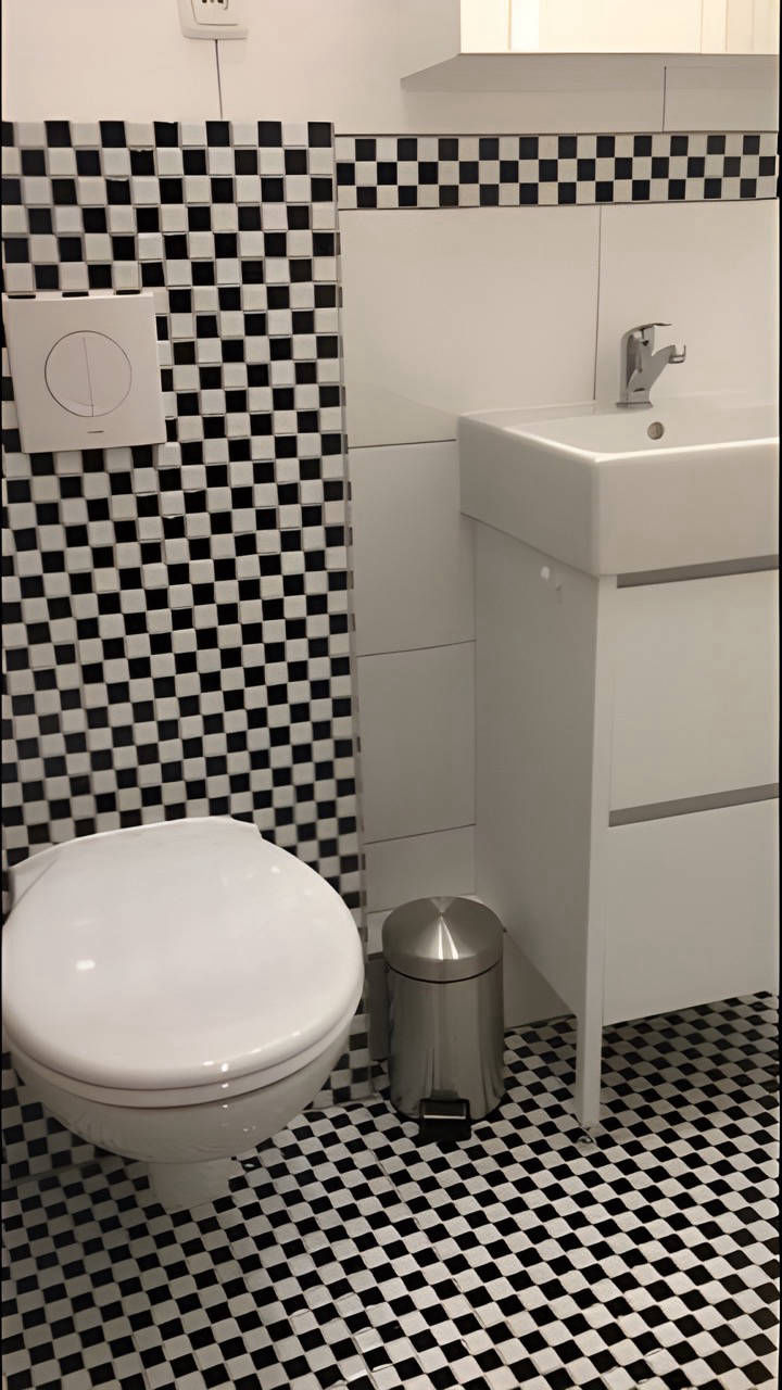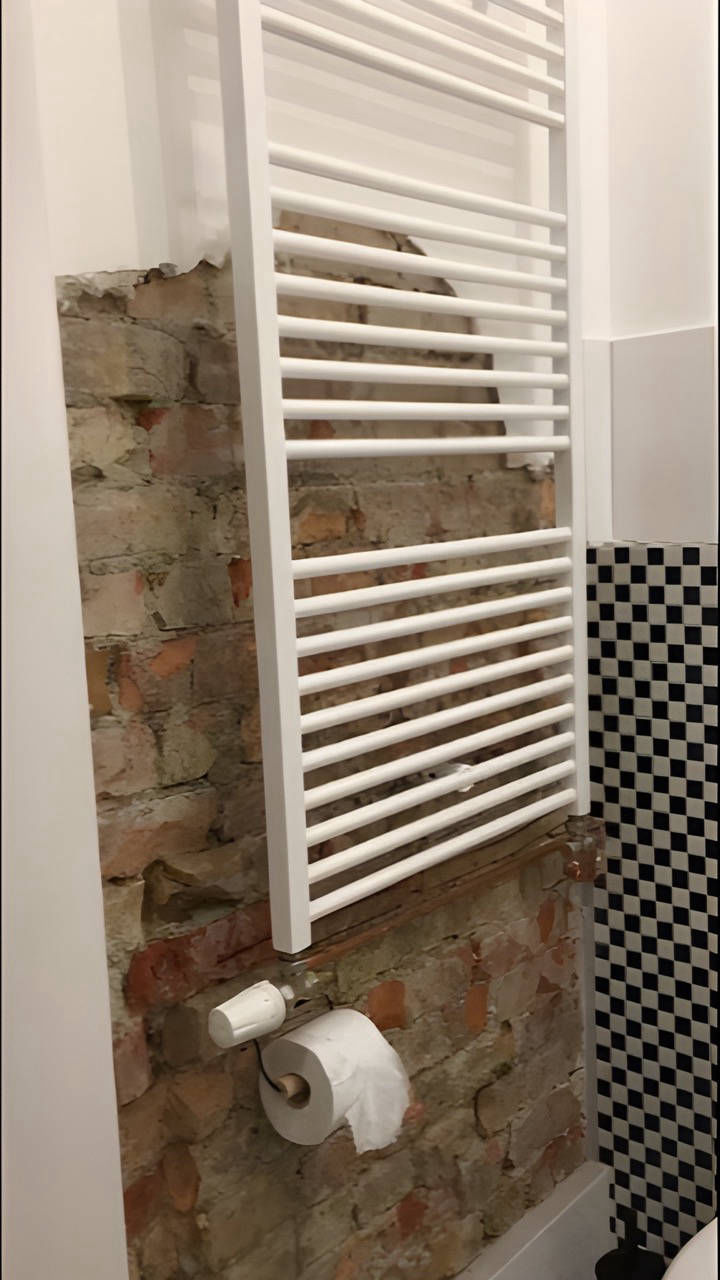 Das schwarz-weiß geflieste Duschbad verfügt über eine natürliche Belichtung und eine Belüftung sowie einen Handtuch-Heizkörper. Ein Teil des alten Mauerwerks ist kunstvoll freigelassen und gibt dem Raum ein besonderes Flair.