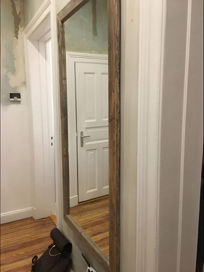 Die Wohnung verfügt über einen Dielenfußboden, hohe Decken und hohe Türen mit schönem Gefache. Die gesamte Wohnung ist weiß gestrichen und im Flur ist ein Stück alte Wand mit Farbputz schick gestaltet hervorgehoben.