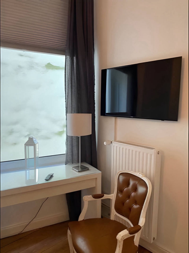 Die schicke Küche ist mit Herd und Spüle, Waschmaschine, Trockner, Geschirrspüle, Mikrowelle und Kühlgefrierkombination namhafter Hersteller sowie mit Geschirr und Küchenutensilien voll ausgestattet. Eine Design-Arbeitsplatte aus Holz mit einem kleinen Sitzbereich rundet die Einrichtung ab und ein wunderschönes historisches Kachelbild sorgt für Gemütlichkeit.