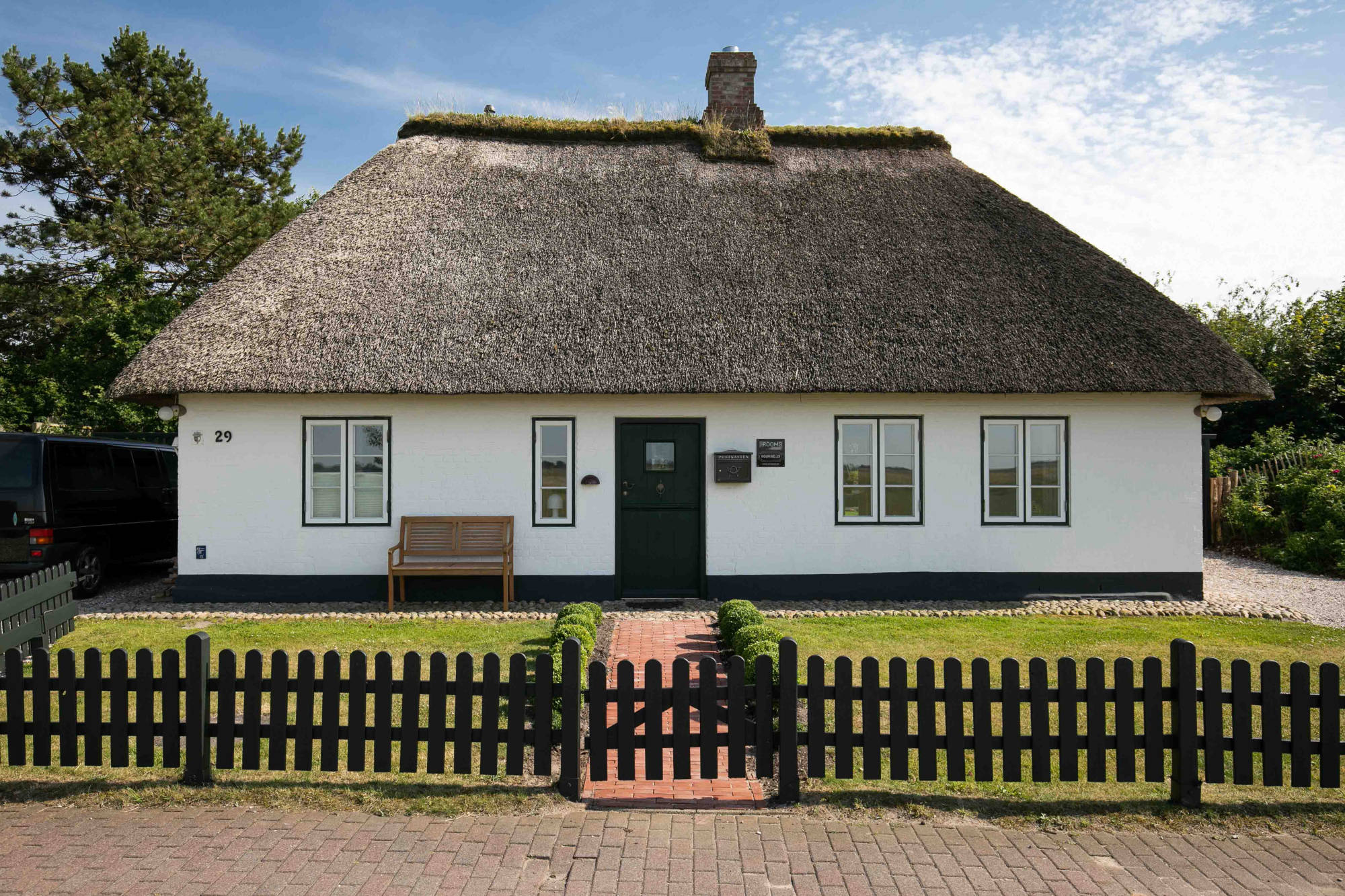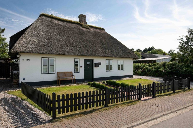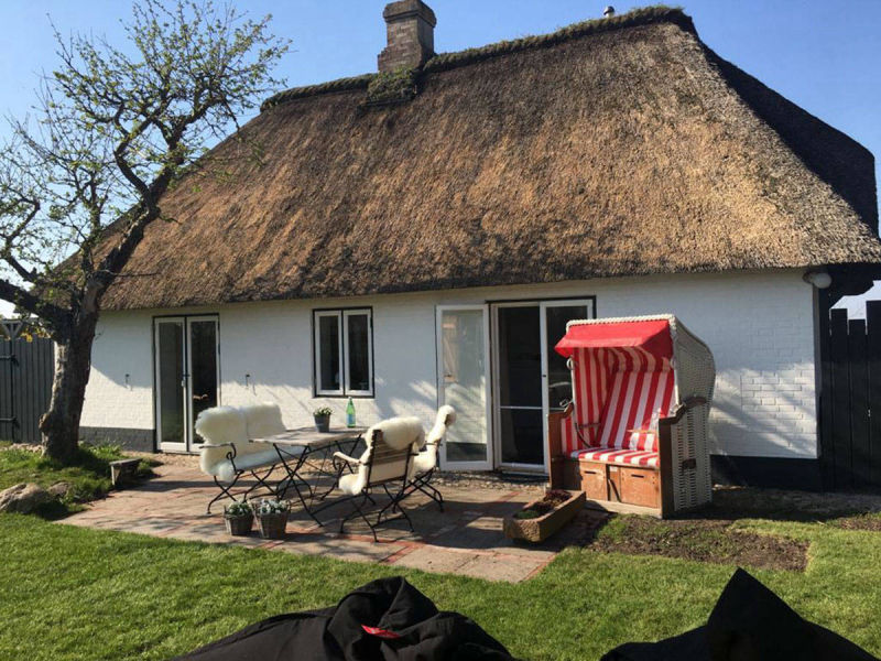 Außen - reetgedeckt, weißes Mauerwerk, dunkelgrüne Eingangstür, weiße Fenster mit dunkelgrünen Blendrahmen. Innen – alle Wände verputzt, Fußböden im Erdgeschoss Eichendielen und Fliesen – Holzdecken mit sichtbarer Balkenlage – kurzum ein echter Traum für 2 (geht auch für 4).