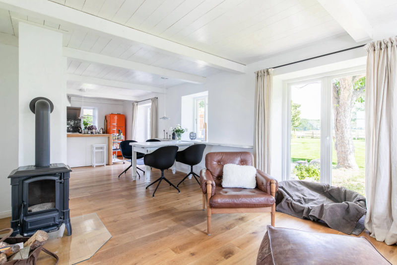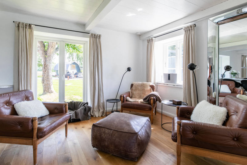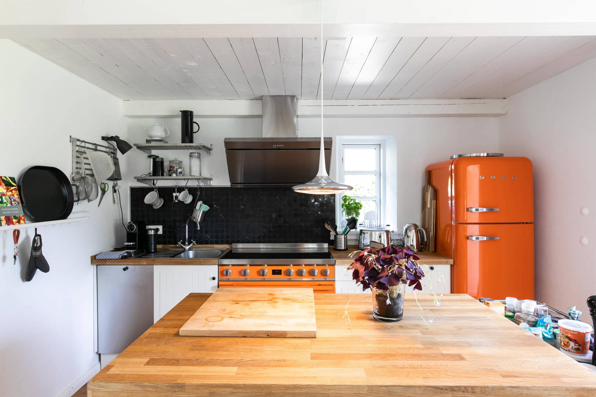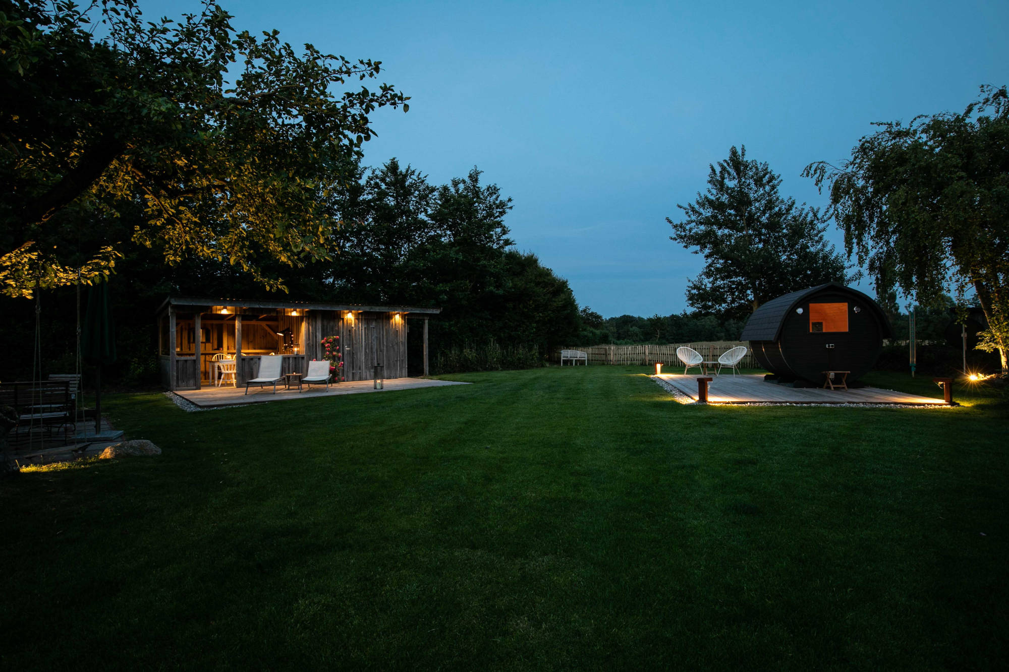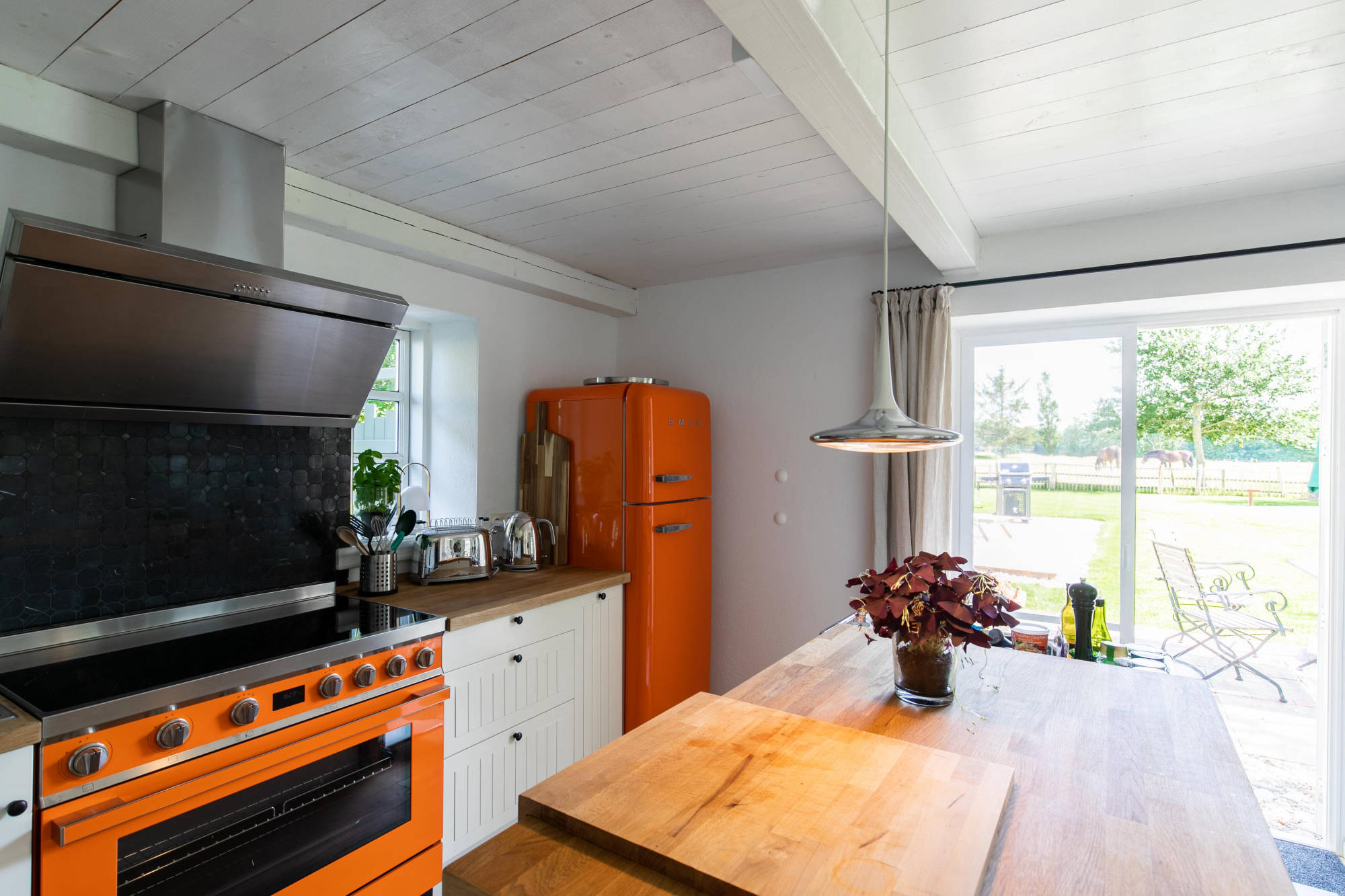 Im nach hinten gelegenen und eingefassten Garten können unsere Gäste Outdoor-Living überdacht oder auf Terrassen genießen, eine Fass-Sauna sorgt für zusätzliche Entschleunigung. Drinnen im offenen Essbereich kann danach auf dem SMEG Portofino Standherd die ganz private Koch-Show gestartet werden.