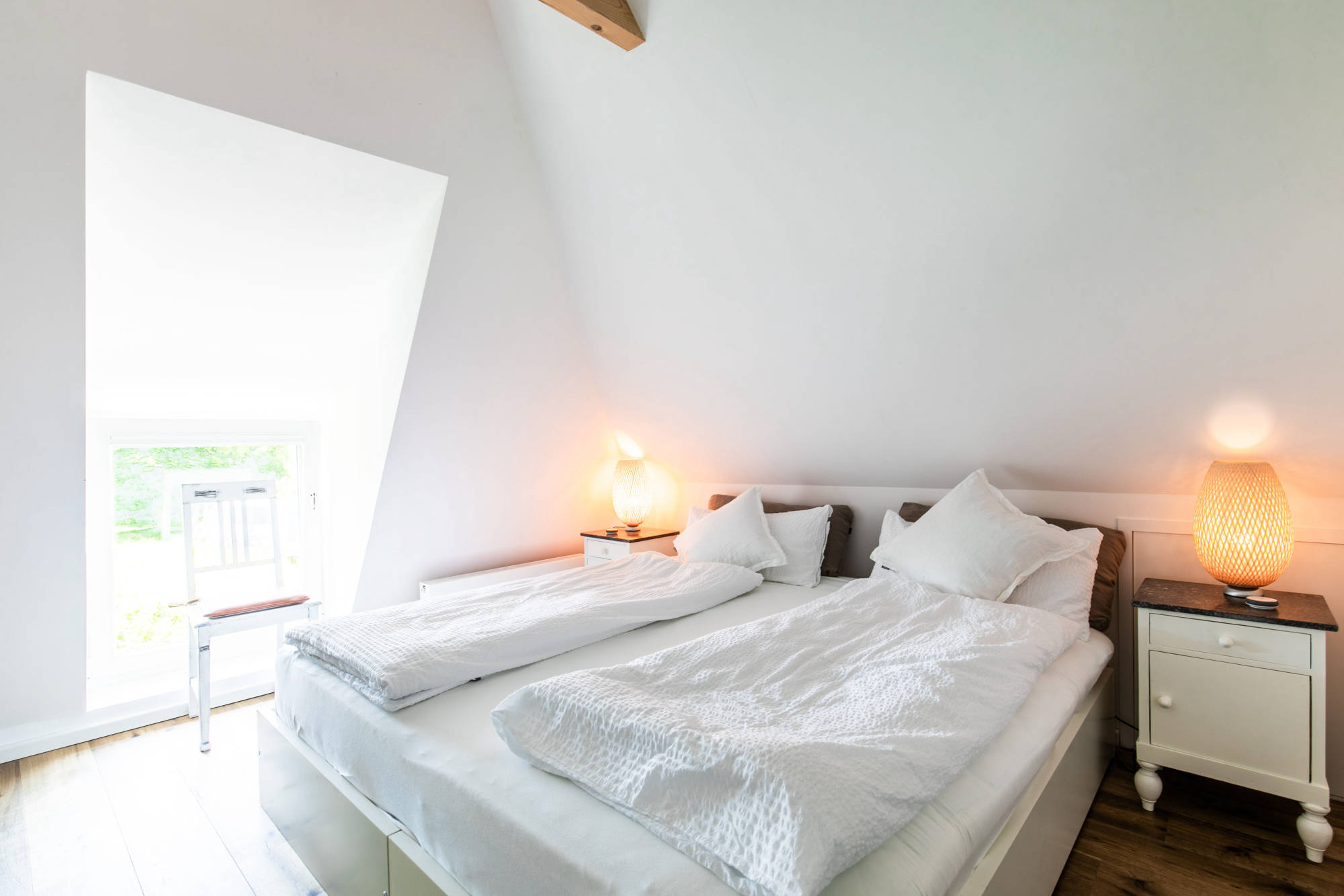 2 (Doppel-)Betten mit hochwertigen Lattenrosten – also Platz für 4, mit XL Bettdecken 155x220cm.