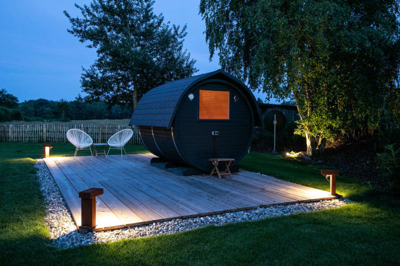 Die Fass-Sauna steht mitten im Garten mit Blick auf die Wiesen und den Tatinger Kirchturm.