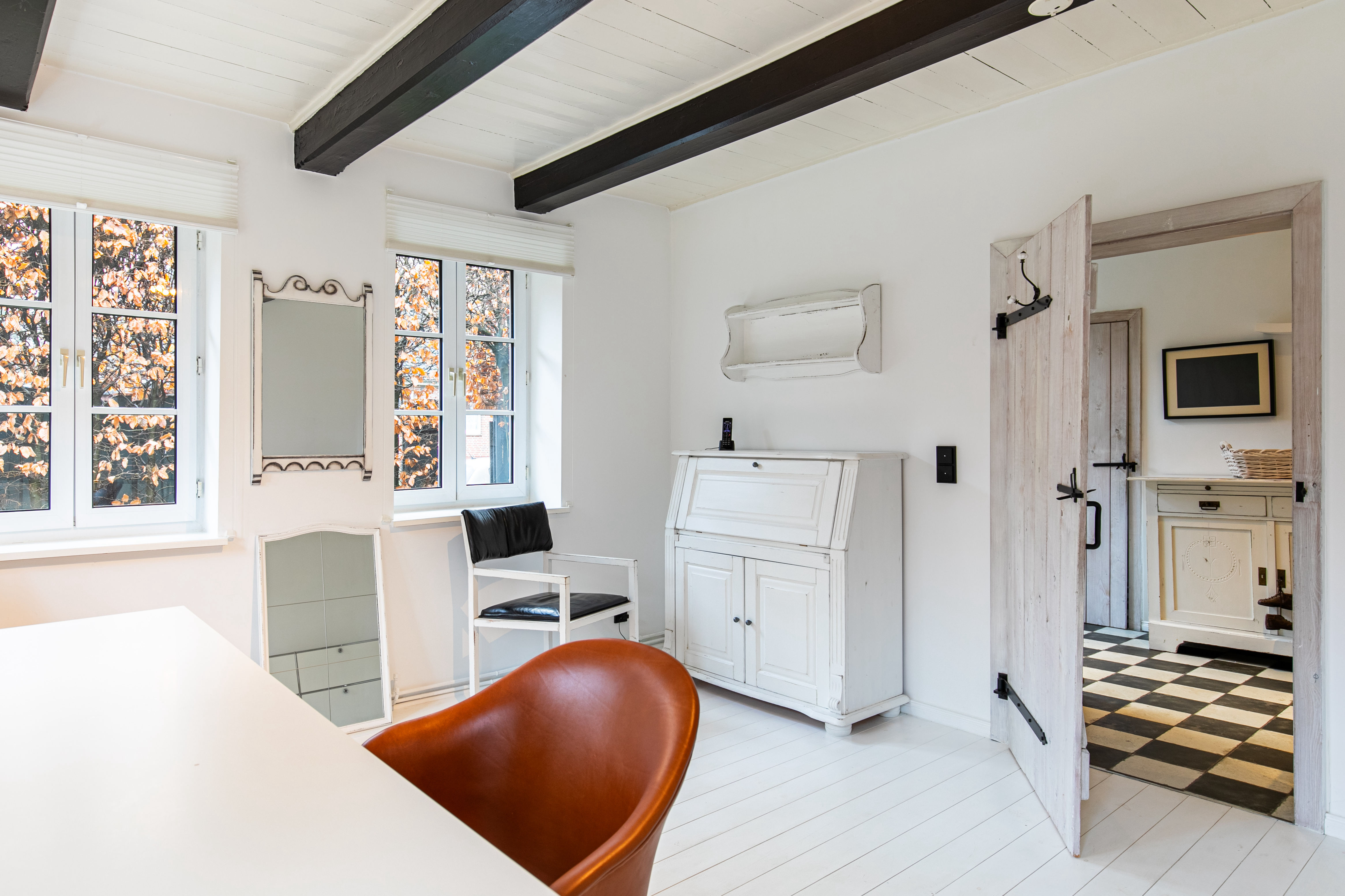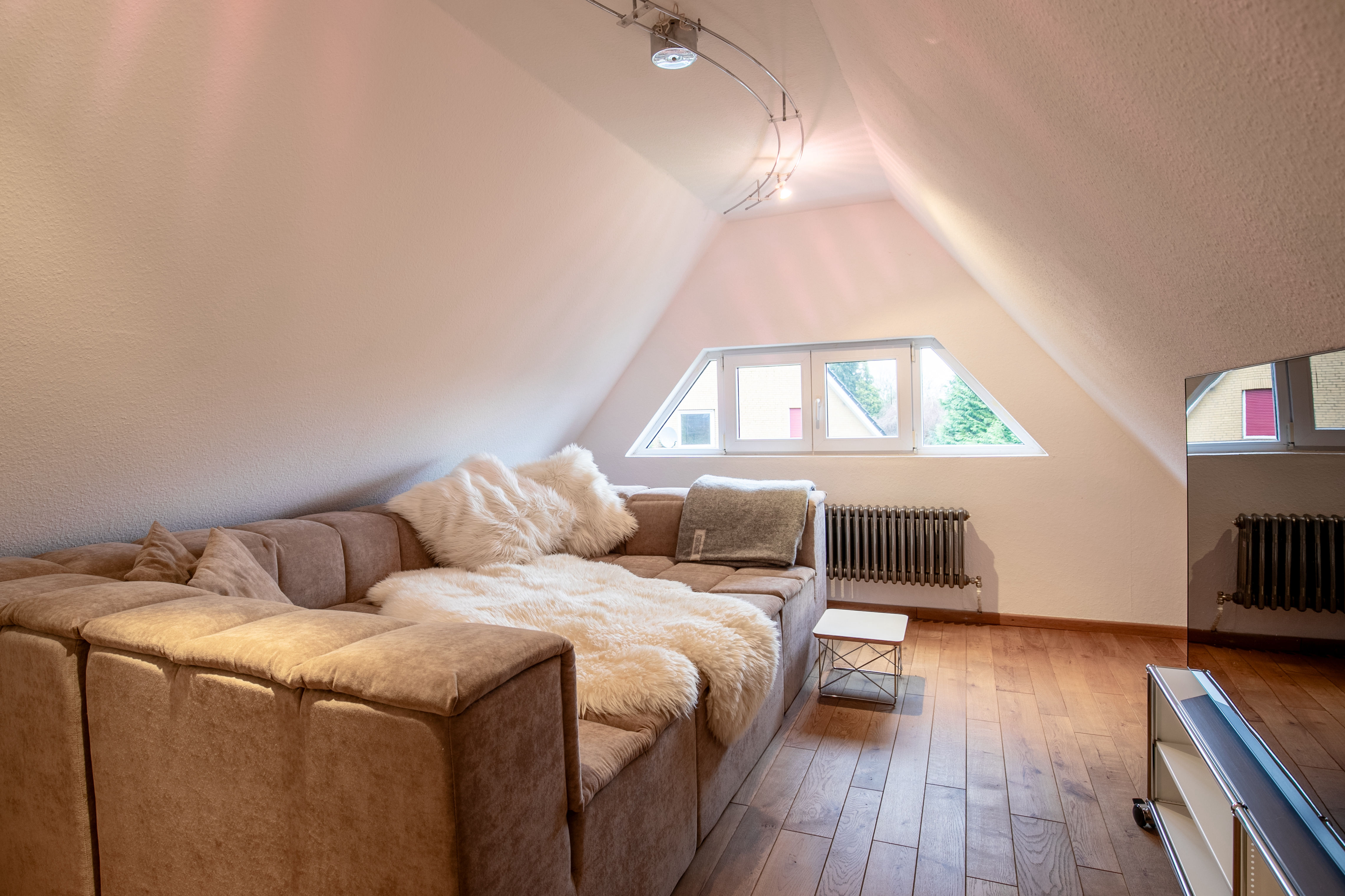 kann wunderbar als Büro genutzt werden, oder auch als Gästeappartement oder „Sports-Room“ – doch der Reihe nach. Sie betreten den Anbau über einen kleinen Flur, öffnen die Tür zum Gäste-Apartment und schon sind Sie in der vollausgestatteten Küche. Von dort aus geht's entweder nach rechts ins Schlafzimmer, geradeaus ins Duschbad oder nach links in den „Sports-Room“ – das macht das Glück perfekt.