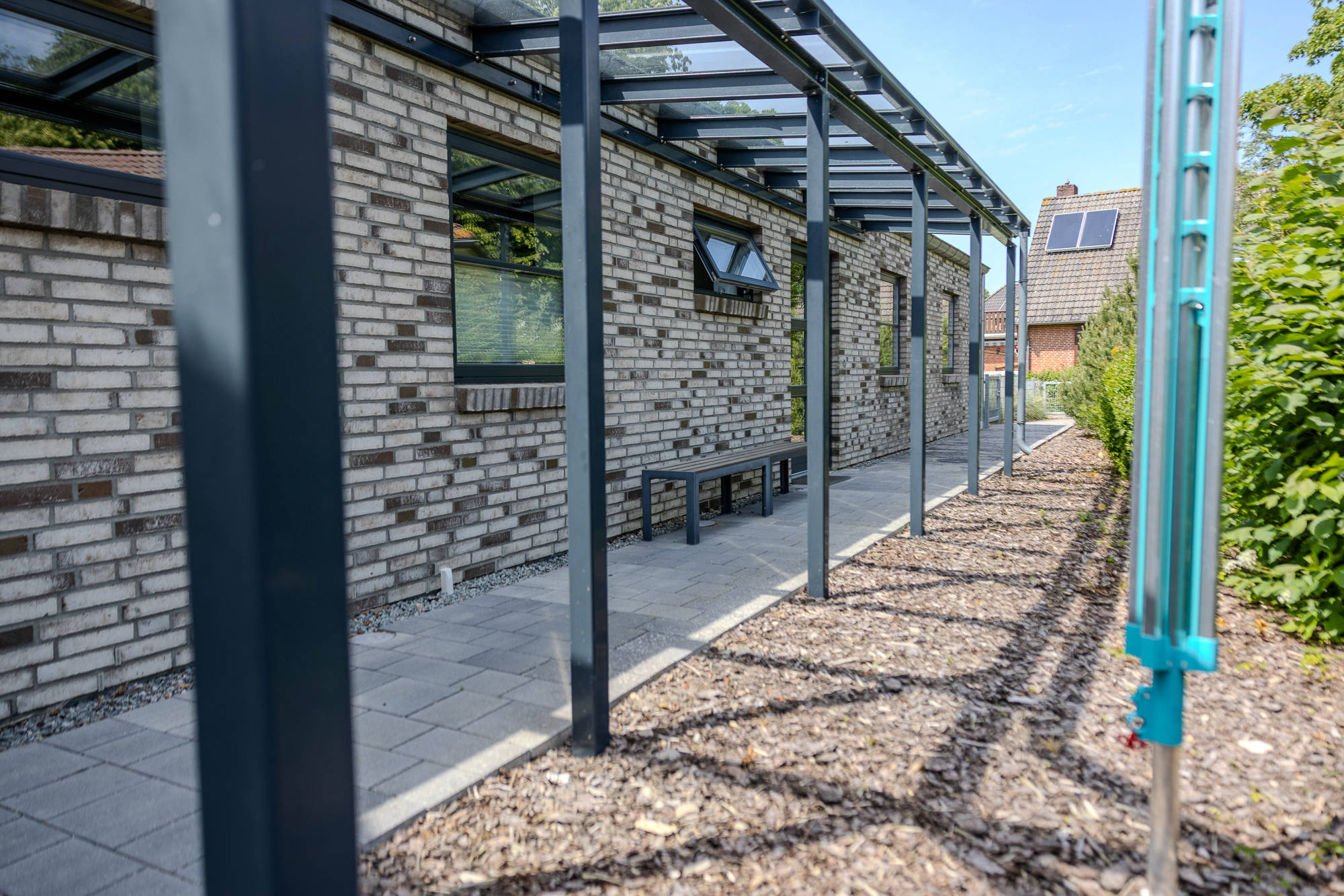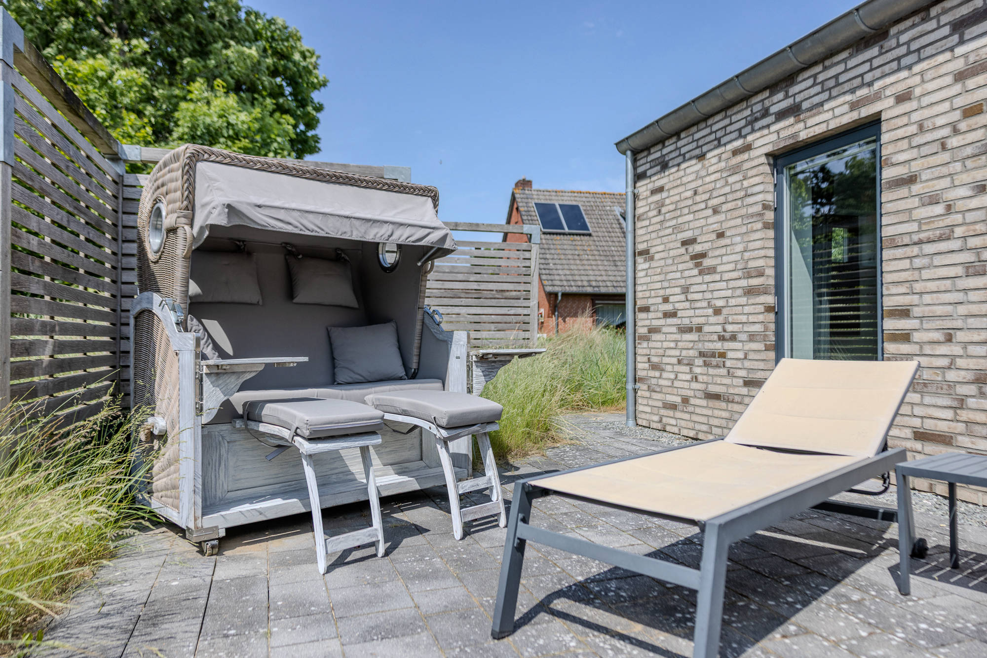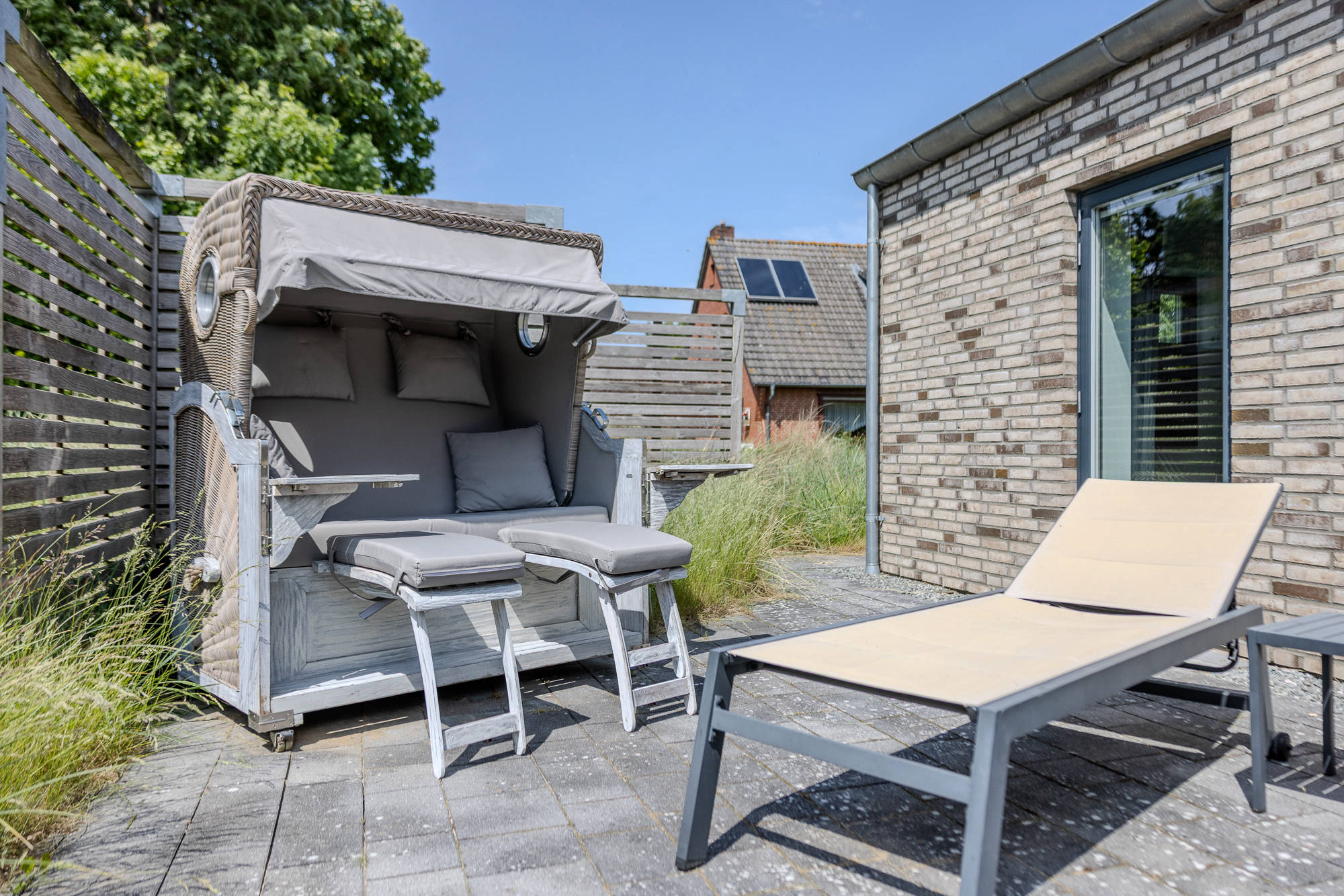 Apropos Draußen – die Terrassen sind beide perfekt ausgestattet. Eine für Sonnen-Anbeter mit Strandkorb und Beach-Club-Sitzecke. Die andere mit Lounge-Möbeln, einer Grill-Ecke und einem Glasdach, unter dem man auch genial sitzen kann, wenn der Wetter-Gott mal weniger gut gelaunt ist – ODER wir eine von diesen tropischen Nächten im Sommer haben (sollen ja mehr werden…).