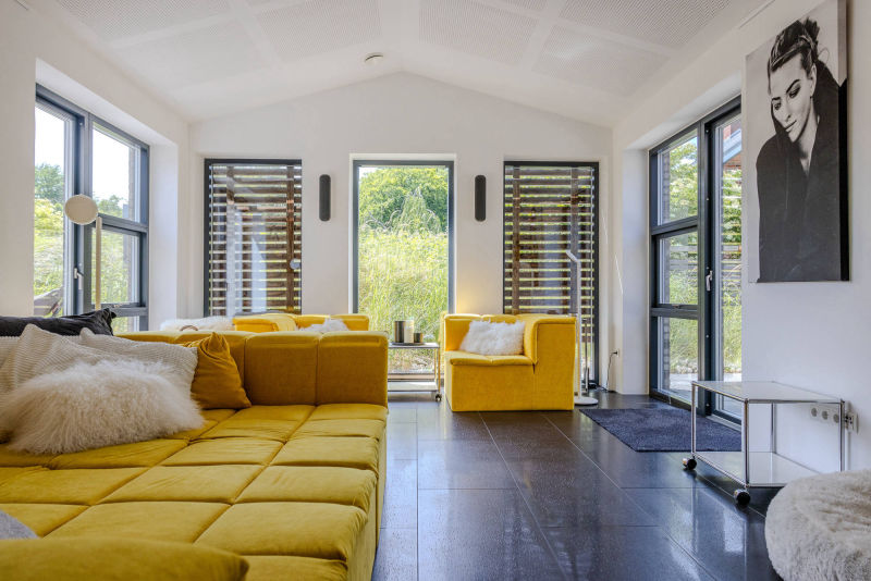 Viele, ganz viele bodentiefe Fenster lassen Licht in den großzügigen Wohn-Essbereich hinein, geben die Blickachsen auf die Terrassen frei und verbinden Drinnen und Draußen in dem Haus zu einem wunderbaren Arrangement.